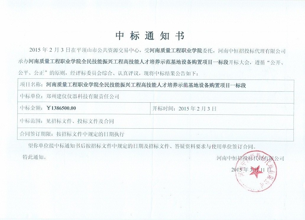 河南質(zhì)量工程職業(yè)技術(shù)學院PZC2014-9588Ag-46236(一標段)中標通知書